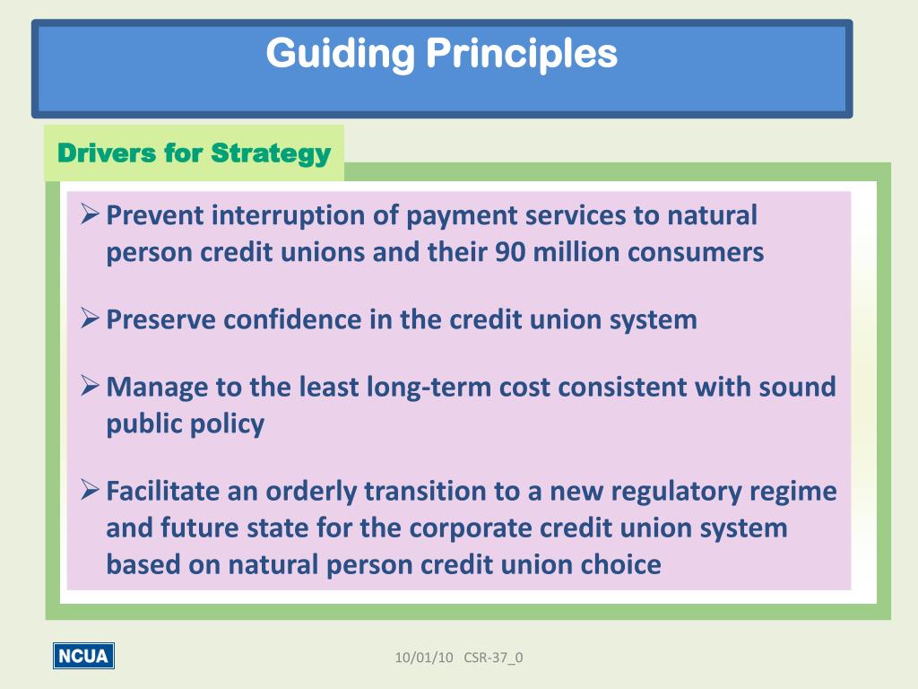 Drivers for Strategy Guiding Principles • Prevent interruption of payment services to natural person credit unions and their 90 million consumers • Preserve confidence in the credit union system • Manage to the least long-term cost consistent with sound public policy • Facilitate an orderly transition to a new regulatory regime and future state for the corporate credit union system based on natural person credit union choice 10/01/10 CSR-37_0
