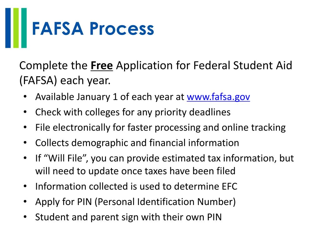 FAFSA Process Complete the Free Application for Federal Student Aid (FAFSA) each year. • Available January 1 of each year at www.fafsa.gov • Check with colleges for any priority deadlines • File electronically for faster processing and online tracking • Collects demographic and financial information • If “Will File”, you can provide estimated tax information, but will need to update once taxes have been filed • Information collected is used to determine EFC • Apply for PIN (Personal Identification Number) • Student and parent sign with their own PIN