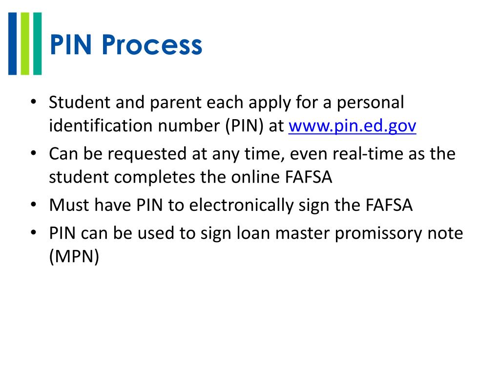 PIN Process • Student and parent each apply for a personal identification number (PIN) at www.pin.ed.gov • Can be requested at any time, even real-time as the student completes the online FAFSA • Must have PIN to electronically sign the FAFSA • PIN can be used to sign loan master promissory note (MPN)
