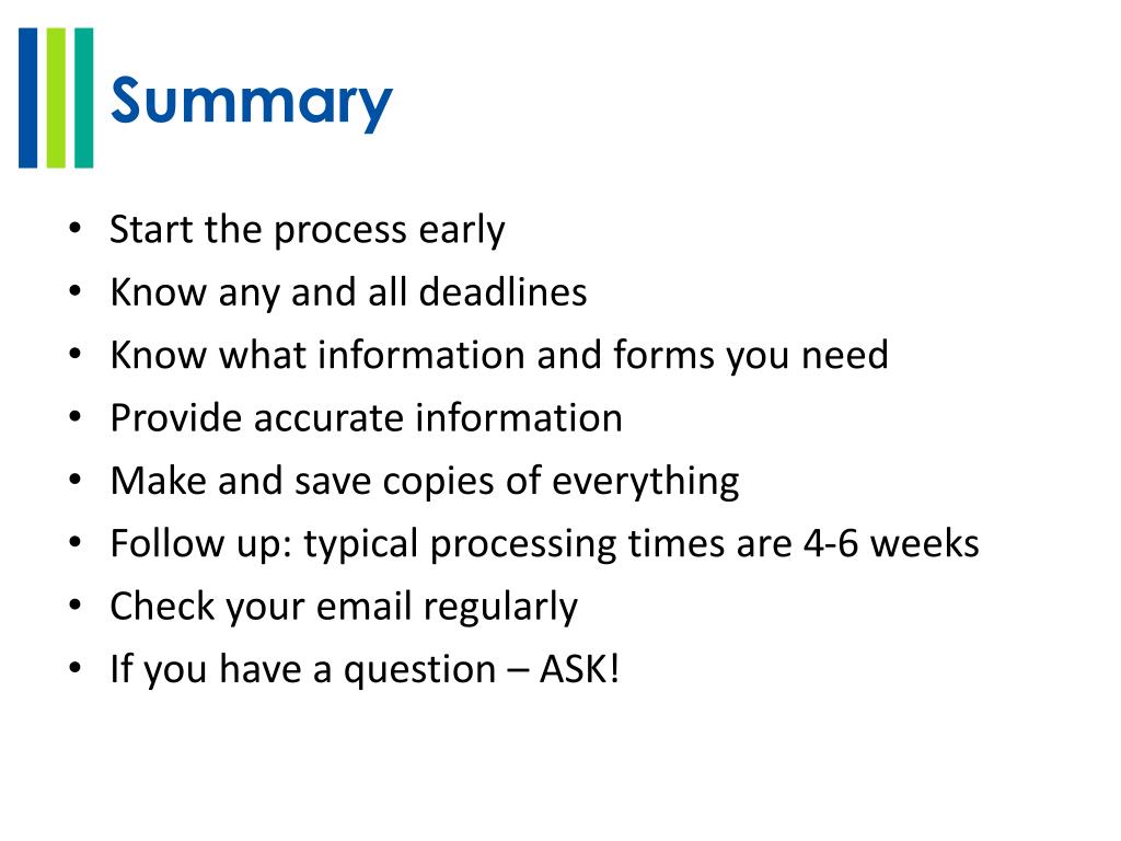 Summary • Start the process early • Know any and all deadlines • Know what information and forms you need • Provide accurate information • Make and save copies of everything • Follow up: typical processing times are 4-6 weeks • Check your email regularly • If you have a question – ASK!