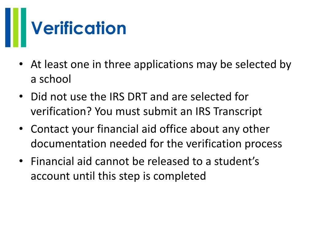 Verification • At least one in three applications may be selected by a school • Did not use the IRS DRT and are selected for verification? You must submit an IRS Transcript • Contact your financial aid office about any other documentation needed for the verification process • Financial aid cannot be released to a student’s account until this step is completed