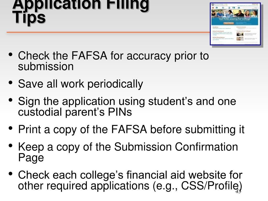 Application Filing Tips Check the FAFSA for accuracy prior to submission Save all work periodically Sign the application using student’s and one custodial parent’s PINs Print a copy of the FAFSA before submitting it Keep a copy of the Submission Confirmation Page Check each college’s financial aid website for other required applications (e.g., CSS/Profile) 45