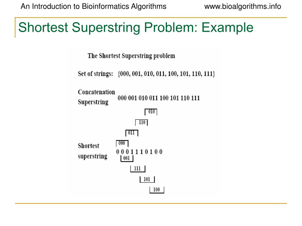 Shortest Superstring Problem • Problem: Given a set of strings, find a shortest string that contains all of them • Input: Strings s1, s2,…., sn • Output: A string s that contains all strings s1, s2,…., sn as substrings, such that the length of s is minimized • Complexity: NP – complete • Note: this formulation does not take into account sequencing errors