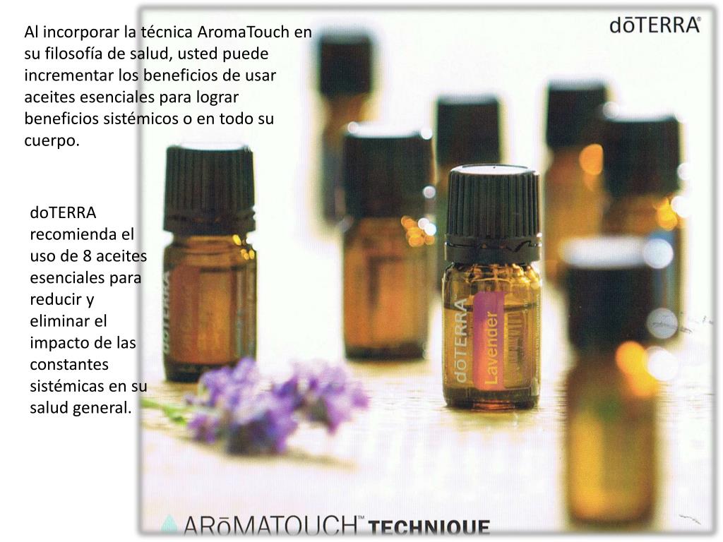 Al incorporar la técnica AromaTouch en su filosofía de salud, usted puede incrementar los beneficios de usar aceites esenciales para lograr beneficios sistémicos o en todo su cuerpo. doTERRA recomienda el uso de 8 aceites esenciales para reducir y eliminar el impacto de las constantes sistémicas en su salud general.
