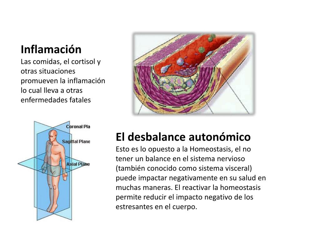 Inflamación Las comidas, el cortisol y otras situaciones promueven la inflamación lo cual lleva a otras enfermedades fatales El desbalance autonómico Esto es lo opuesto a la Homeostasis, el no tener un balance en el sistema nervioso (también conocido como sistema visceral) puede impactar negativamente en su salud en muchas maneras. El reactivar la homeostasis permite reducir el impacto negativo de los estresantes en el cuerpo.