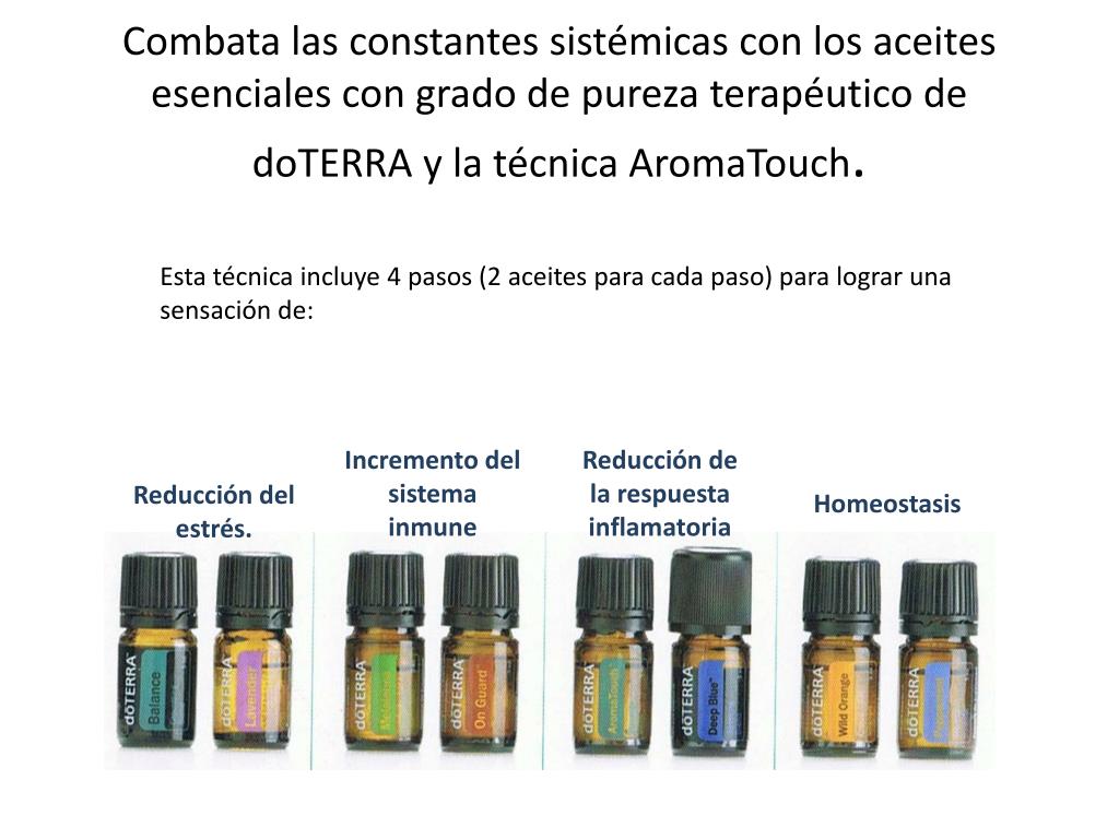 Combata las constantes sistémicas con los aceites esenciales con grado de pureza terapéutico de doTERRAy la técnica AromaTouch. Esta técnica incluye 4 pasos (2 aceites para cada paso) para lograr una sensación de: Incremento del sistema inmune Reducción de la respuesta inflamatoria Reducción del estrés. Homeostasis