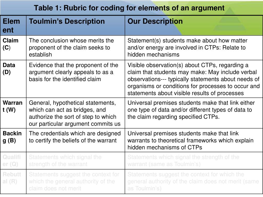 Methods (Continued) • Data analyses • We used a modified version of Toulmin’s (1958) model of argument analysis (See table 1 below) • Interviews were designed to elicit students’ accounts or Claims (C) • Research Question and Toulmin’s analytical framework • We were interested in how students support their claims with Data (D), and usually Warrants (W). Additionally, we sought to understand how students use, if at all, Backing (B) to construct arguments relating to CTP