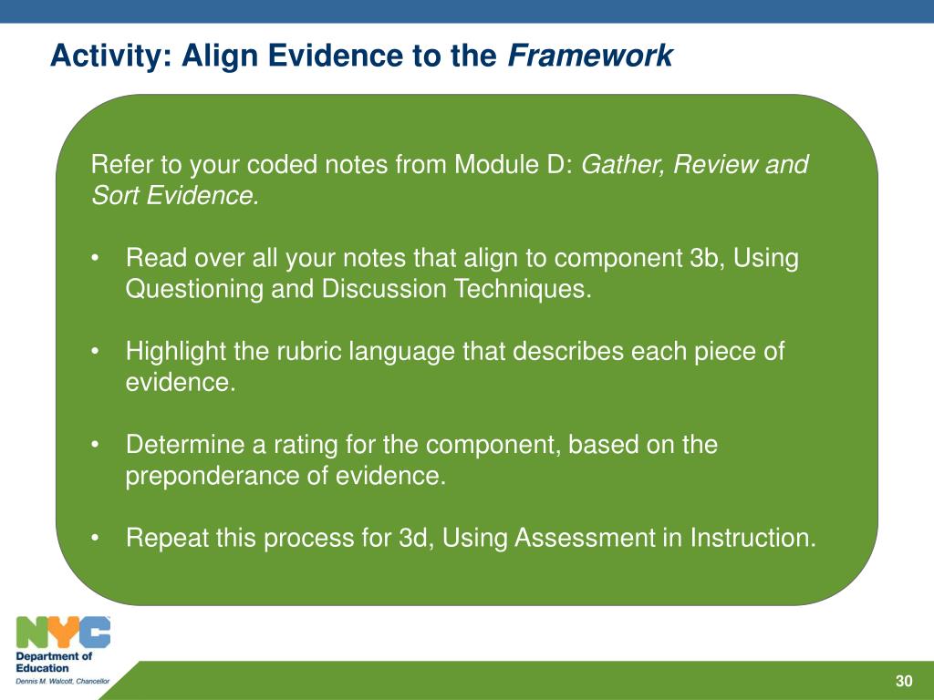 Activity: Align Evidence to the Framework • Refer to your coded notes from Module D: Gather, Review and Sort Evidence. • Read over all your notes that align to component 3b, Using Questioning and Discussion Techniques. • Highlight the rubric language that describes each piece of evidence. • Determine a rating for the component, based on the preponderance of evidence. • Repeat this process for 3d, Using Assessment in Instruction.