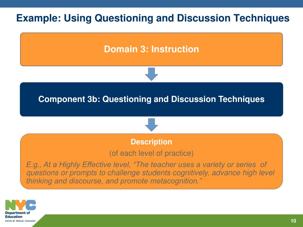 Example: Using Questioning and Discussion Techniques • Domain 3: Instruction • Component 3b: Questioning and Discussion Techniques • Description • (of each level of practice) • E.g., At a Highly Effective level, “The teacher uses a variety or series of questions or prompts to challenge students cognitively, advance high level thinking and discourse, and promote metacognition.”