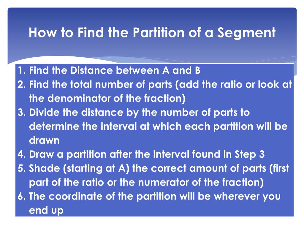 Partition – 1 Dimension 11. • A is at -6 and B is at 4. • Find the point, T, so that T is A to B in a 2:3 ratio.