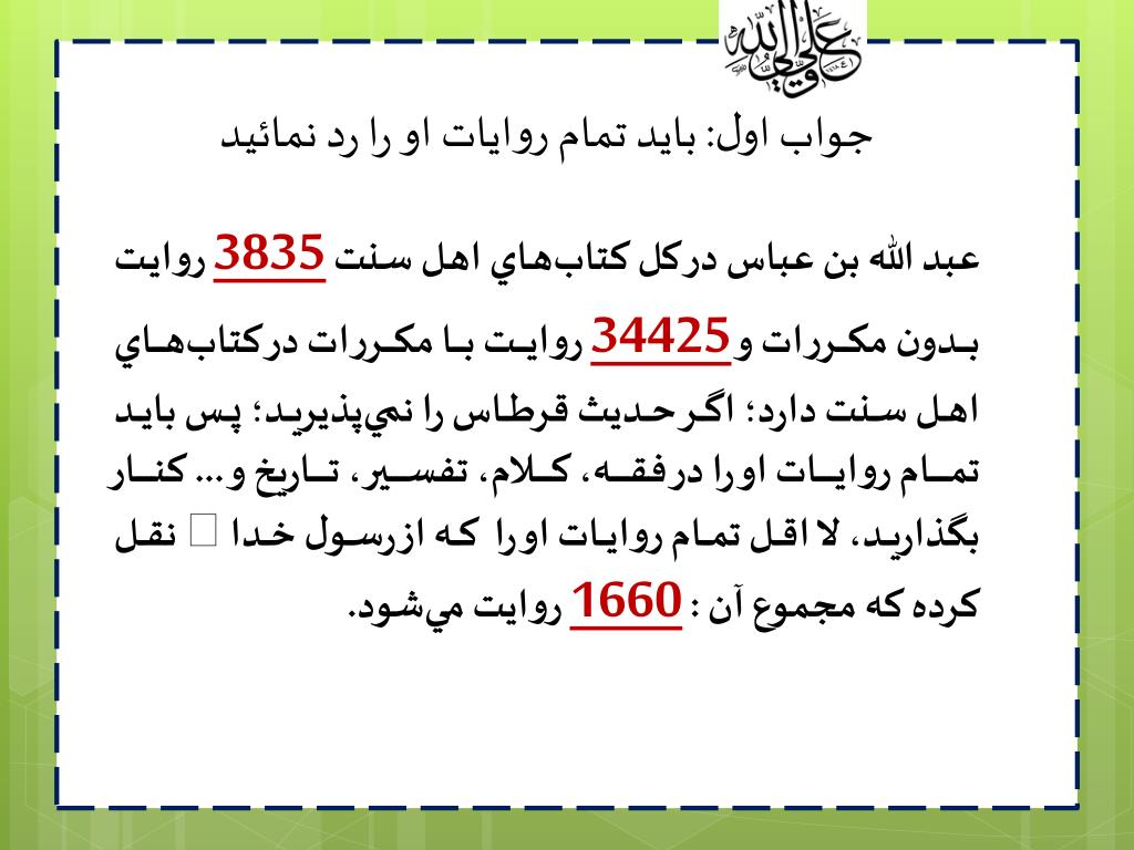 جواب اول: بايد تمام روايات او را رد نمائيد عبد الله بن عباس در كل كتابهاي اهل سنت 3835 روايت بدون مكررات و 34425 روايت با مكررات در كتابهاي اهل سنت دارد؛ اگر حديث قرطاس را نميپذيريد؛ پس بايد تمام روايات او را در فقه، كلام، تفسير، تاريخ و ... كنار بگذاريد، لا اقل تمام روايات او را كه از رسول خدا نقل كرده كه مجموع آن : 1660 روايت ميشود.