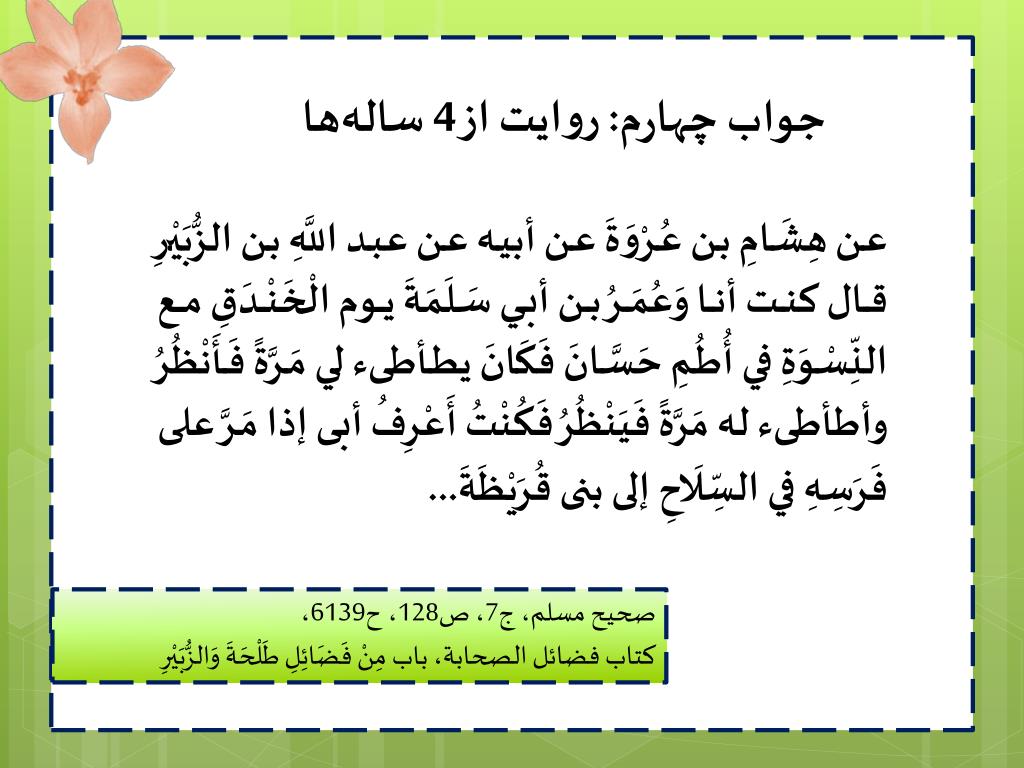 جواب چهارم: روايت از 4 سالهها • عن هِشَامِ بن عُرْوَةَ عن أبيه عن عبد اللَّهِ بن الزُّبَيْرِ قال كنت أنا وَعُمَرُ بن أبي سَلَمَةَ يوم الْخَنْدَقِ مع النِّسْوَةِ في أُطُمِ حَسَّانَ فَكَانَ يطأطىء لي مَرَّةً فَأَنْظُرُ وأطأطىء له مَرَّةً فَيَنْظُرُ فَكُنْتُ أَعْرِفُ أبى إذا مَرَّ على فَرَسِهِ في السِّلَاحِ إلى بنى قُرَيْظَةَ... صحيح مسلم، ج7، ص128، ح6139، كتاب فضائل الصحابة، باب مِنْ فَضَائِلِ طَلْحَةَ وَالزُّبَيْرِ