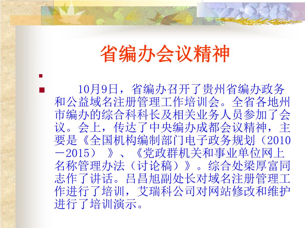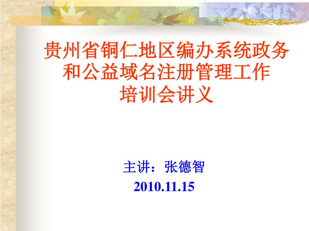 贵州省铜仁地区编办系统政务和公益域名注册管理工作 培训会讲义. 主讲:张德智 2010.11. 15. 省编办会议精神. 10 月 9 日,省编办召开了贵州省编办政务和公益域名注册管理工作培训会。全省各地州市编办的综合科科长及相关业务人员参加了会议。会上,传达了中央编办成都会议精神,主要是 《 全国机构编制部门电子政务规划( 2010 - 2015 ) 》 、 《 党政群机关和事业单位网上名称管理办法(讨论稿) 》 。综合处梁厚富同志作了讲话。吕昌旭副处长对域名注册管理工作进行了培训,艾瑞科公司对网站修改和维护进行了培训演示。. 一、成都会议精神. (一)会议概况