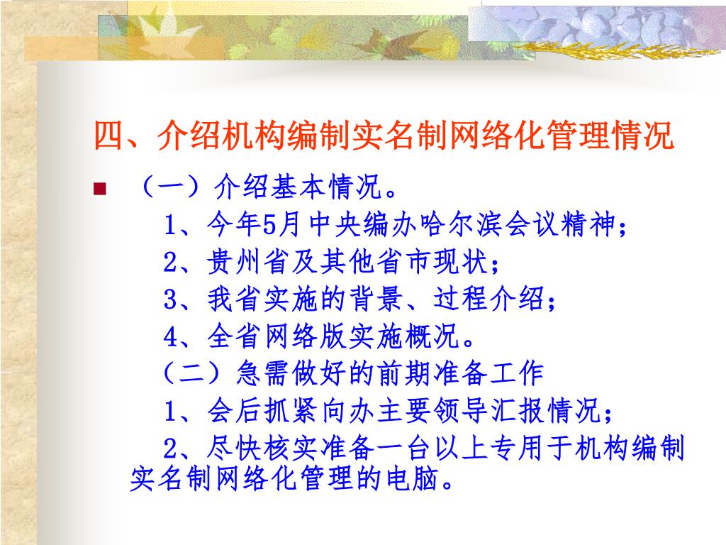 四、介绍机构编制实名制网络化管理情况 • (一)介绍基本情况。 1、今年5月中央编办哈尔滨会议精神; 2、贵州省及其他省市现状; 3、我省实施的背景、过程介绍; 4、全省网络版实施概况。 (二)急需做好的前期准备工作 1、会后抓紧向办主要领导汇报情况; 2、尽快核实准备一台以上专用于机构编制实名制网络化管理的电脑。