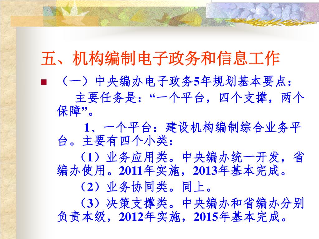 五、机构编制电子政务和信息工作 • (一)中央编办电子政务5年规划基本要点: 主要任务是:“一个平台,四个支撑,两个保障”。 1、一个平台:建设机构编制综合业务平台。主要有四个小类: (1)业务应用类。中央编办统一开发,省编办使用。2011年实施,2013年基本完成。 (2)业务协同类。同上。 (3)决策支撑类。中央编办和省编办分别负责本级,2012年实施,2015年基本完成。