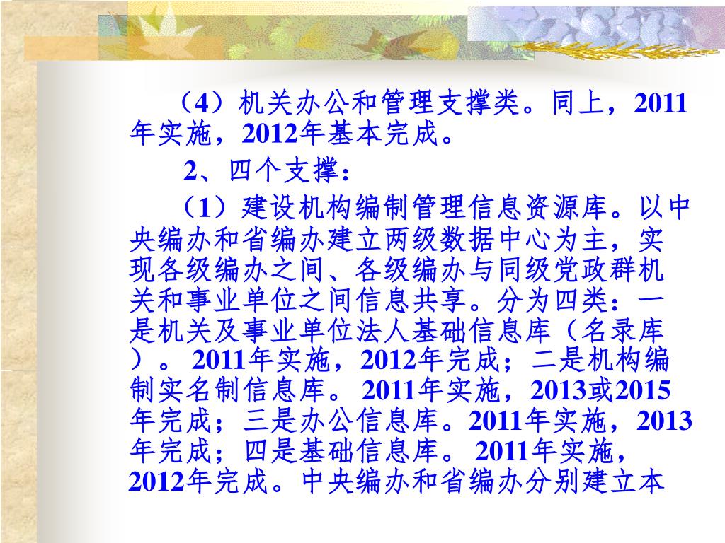 (4)机关办公和管理支撑类。同上,2011年实施,2012年基本完成。(4)机关办公和管理支撑类。同上,2011年实施,2012年基本完成。 2、四个支撑: (1)建设机构编制管理信息资源库。以中央编办和省编办建立两级数据中心为主,实现各级编办之间、各级编办与同级党政群机关和事业单位之间信息共享。分为四类:一是机关及事业单位法人基础信息库(名录库)。 2011年实施,2012年完成;二是机构编制实名制信息库。 2011年实施,2013或2015年完成;三是办公信息库。2011年实施,2013年完成;四是基础信息库。 2011年实施,2012年完成。中央编办和省编办分别建立本
