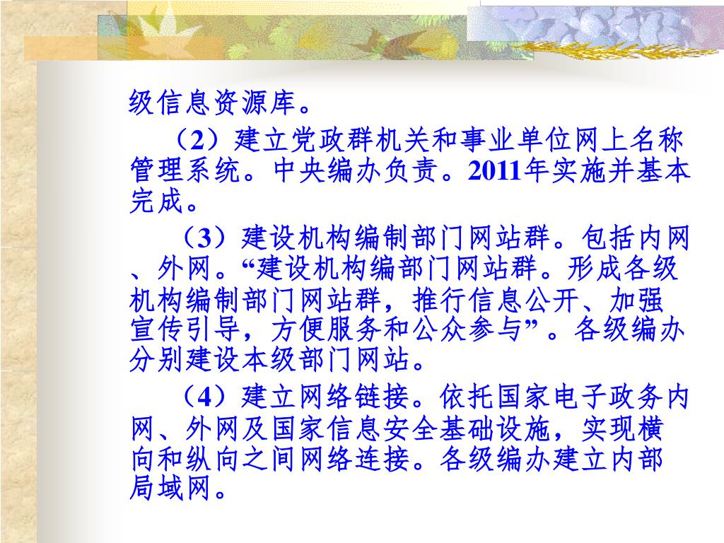 级信息资源库。 (2)建立党政群机关和事业单位网上名称管理系统。中央编办负责。2011年实施并基本完成。 (3)建设机构编制部门网站群。包括内网、外网。“建设机构编部门网站群。形成各级机构编制部门网站群,推行信息公开、加强宣传引导,方便服务和公众参与” 。各级编办分别建设本级部门网站。 (4)建立网络链接。依托国家电子政务内网、外网及国家信息安全基础设施,实现横向和纵向之间网络连接。各级编办建立内部局域网。