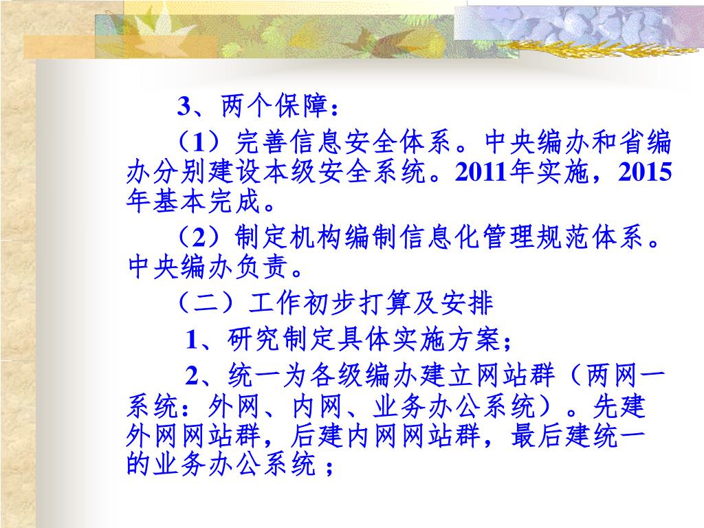 3、两个保障: (1)完善信息安全体系。中央编办和省编办分别建设本级安全系统。2011年实施,2015年基本完成。 (2)制定机构编制信息化管理规范体系。中央编办负责。 (二)工作初步打算及安排 1、研究制定具体实施方案; 2、统一为各级编办建立网站群(两网一系统:外网、内网、业务办公系统)。先建外网网站群,后建内网网站群,最后建统一的业务办公系统 ;