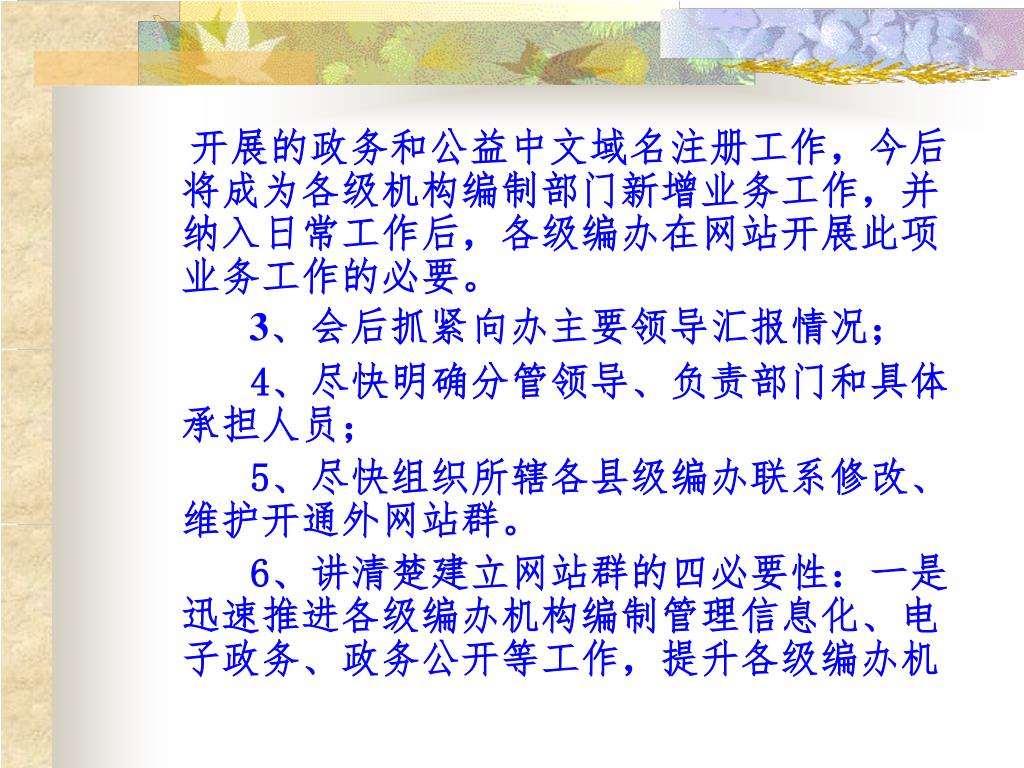 开展的政务和公益中文域名注册工作,今后将成为各级机构编制部门新增业务工作,并纳入日常工作后,各级编办在网站开展此项业务工作的必要。开展的政务和公益中文域名注册工作,今后将成为各级机构编制部门新增业务工作,并纳入日常工作后,各级编办在网站开展此项业务工作的必要。 3、会后抓紧向办主要领导汇报情况; 4、尽快明确分管领导、负责部门和具体承担人员; 5、尽快组织所辖各县级编办联系修改、维护开通外网站群。 6、讲清楚建立网站群的四必要性:一是迅速推进各级编办机构编制管理信息化、电子政务、政务公开等工作,提升各级编办机