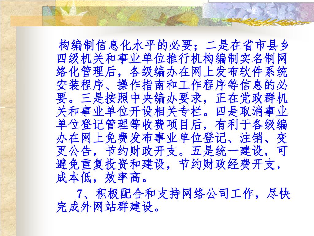 构编制信息化水平的必要;二是在省市县乡四级机关和事业单位推行机构编制实名制网络化管理后,各级编办在网上发布软件系统安装程序、操作指南和工作程序等信息的必要。三是按照中央编办要求,正在党政群机关和事业单位开设相关专栏。四是取消事业单位登记管理等收费项目后,有利于各级编办在网上免费发布事业单位登记、注销、变更公告,节约财政开支。五是统一建设,可避免重复投资和建设,节约财政经费开支,成本低,效率高。 7、积极配合和支持网络公司工作,尽快完成外网站群建设。