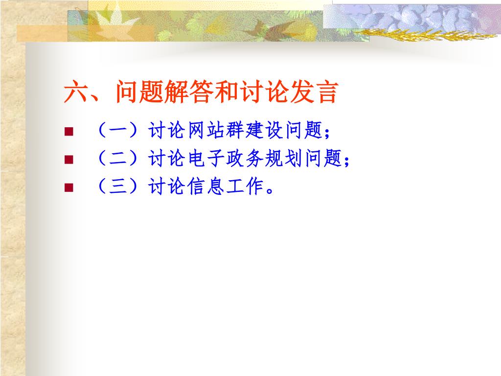 六、问题解答和讨论发言 • (一)讨论网站群建设问题; • (二)讨论电子政务规划问题; • (三)讨论信息工作。