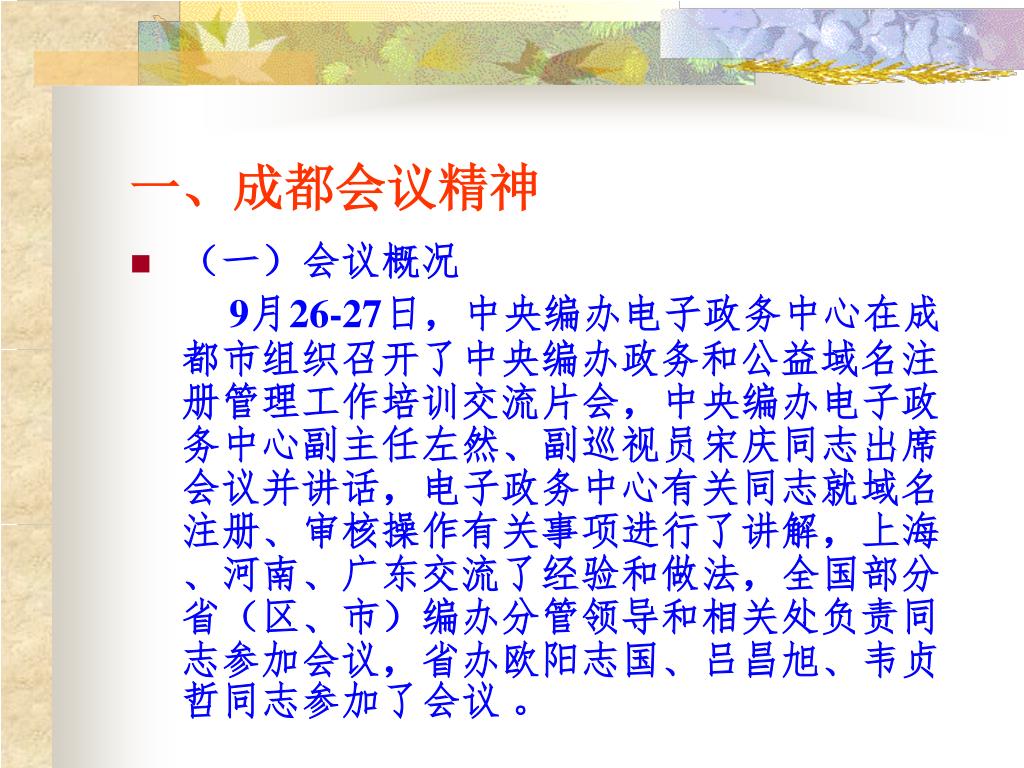 一、成都会议精神 • (一)会议概况 9月26-27日,中央编办电子政务中心在成都市组织召开了中央编办政务和公益域名注册管理工作培训交流片会,中央编办电子政务中心副主任左然、副巡视员宋庆同志出席会议并讲话,电子政务中心有关同志就域名注册、审核操作有关事项进行了讲解,上海、河南、广东交流了经验和做法,全国部分省(区、市)编办分管领导和相关处负责同志参加会议,省办欧阳志国、吕昌旭、韦贞哲同志参加了会议 。