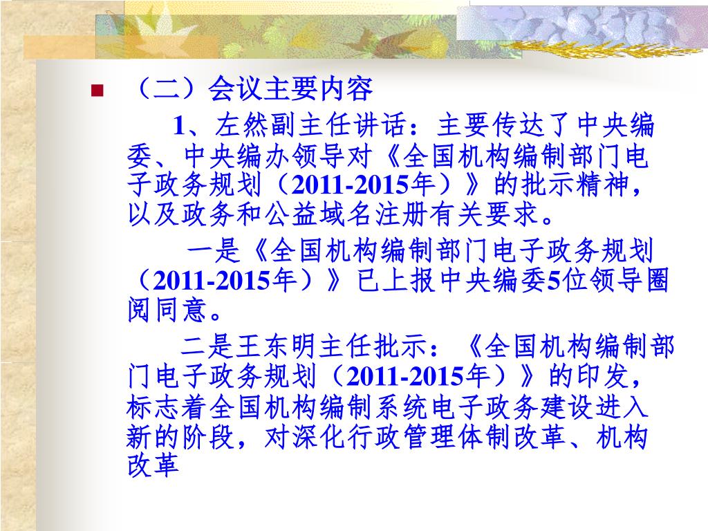 (二)会议主要内容 1、左然副主任讲话:主要传达了中央编委、中央编办领导对《全国机构编制部门电子政务规划(2011-2015年)》的批示精神,以及政务和公益域名注册有关要求。 一是《全国机构编制部门电子政务规划(2011-2015年)》已上报中央编委5位领导圈阅同意。 二是王东明主任批示:《全国机构编制部门电子政务规划(2011-2015年)》的印发,标志着全国机构编制系统电子政务建设进入新的阶段,对深化行政管理体制改革、机构改革