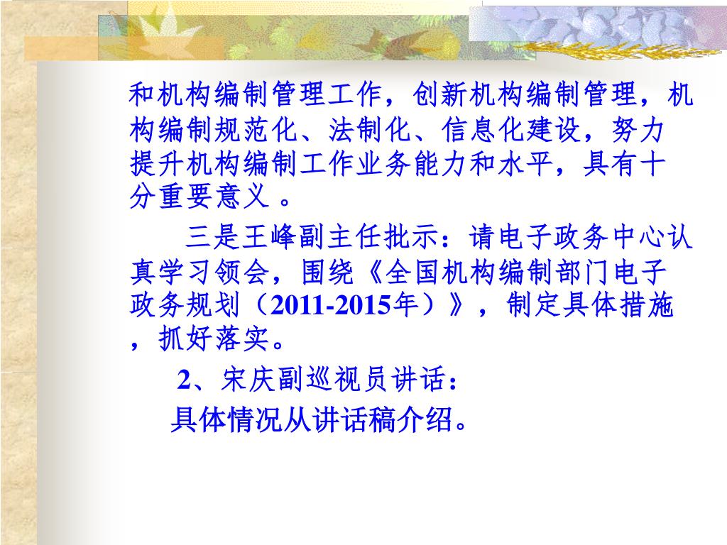 和机构编制管理工作,创新机构编制管理,机构编制规范化、法制化、信息化建设,努力提升机构编制工作业务能力和水平,具有十分重要意义 。 三是王峰副主任批示:请电子政务中心认真学习领会,围绕《全国机构编制部门电子政务规划(2011-2015年)》,制定具体措施,抓好落实。 2、宋庆副巡视员讲话: 具体情况从讲话稿介绍。