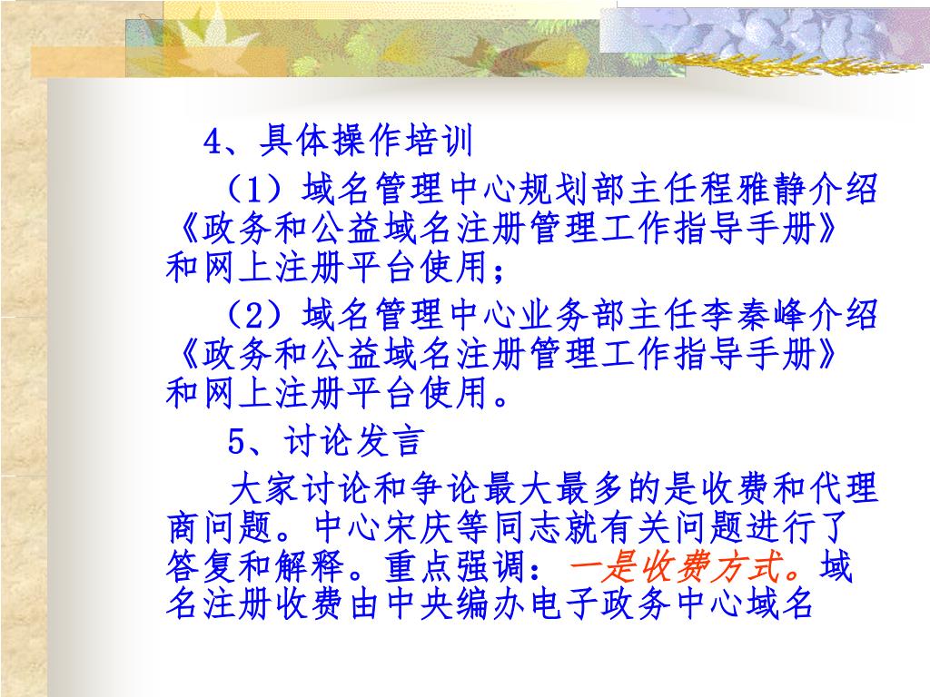 4、具体操作培训 (1)域名管理中心规划部主任程雅静介绍《政务和公益域名注册管理工作指导手册》和网上注册平台使用; (2)域名管理中心业务部主任李秦峰介绍《政务和公益域名注册管理工作指导手册》和网上注册平台使用。 5、讨论发言 大家讨论和争论最大最多的是收费和代理商问题。中心宋庆等同志就有关问题进行了答复和解释。重点强调:一是收费方式。域名注册收费由中央编办电子政务中心域名