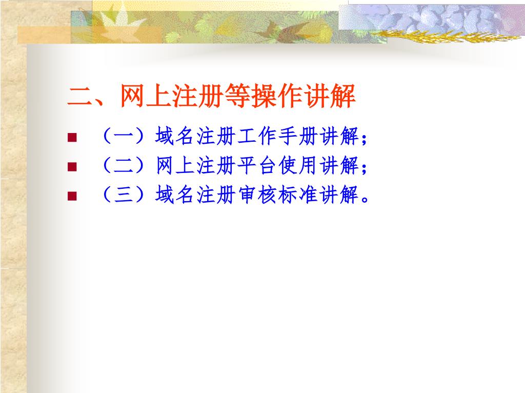 二、网上注册等操作讲解 • (一)域名注册工作手册讲解; • (二)网上注册平台使用讲解; • (三)域名注册审核标准讲解。