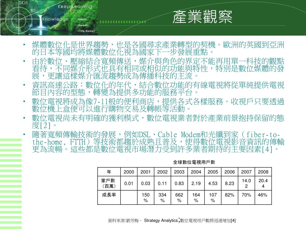 產業觀察 • 媒體數位化是世界趨勢,也是各國尋求產業轉型的契機。歐洲的英國到亞洲的日本等國均將媒體數位化視為國家下一步發展重點。 • 由於數位、壓縮結合寬頻傳送,媒介與角色的界定不能再用單一科技的觀點看待,不同媒介形式也具有相同或相似的功能與特性,特別是數位媒體的發展,更讓這樣媒介匯流趨勢成為傳播科技的主流。 • 資訊高速公路:數位化的年代,結合數位功能的有線電視將從單純提供電視節目內容的型態,轉變為提供多功能的服務平台。 • 數位電視將成為像7-11般的便利商店,提供各式各樣服務。收視戶只要透過數位機上盒便可以進行購物交易及轉帳等活動。 • 數位電視尚未有明確的獲利模式,數位電視業者對於產業前景抱持保留的態度[2]。 • 隨著寬頻傳輸技術的發展,例如DSL、Cable Modem和光纖到家(fiber-to-the-home, FTTH)等技術都趨於成熟且普及,使得數位電視影音資訊的傳輸更為流暢。這些都是數位電視市場潛力受到許多業者期待的主要因素[4]。 全球數位電視用戶數 資料來源:劉芳梅, Strategy Analytics;數位電視用戶數將迅速增加[4]