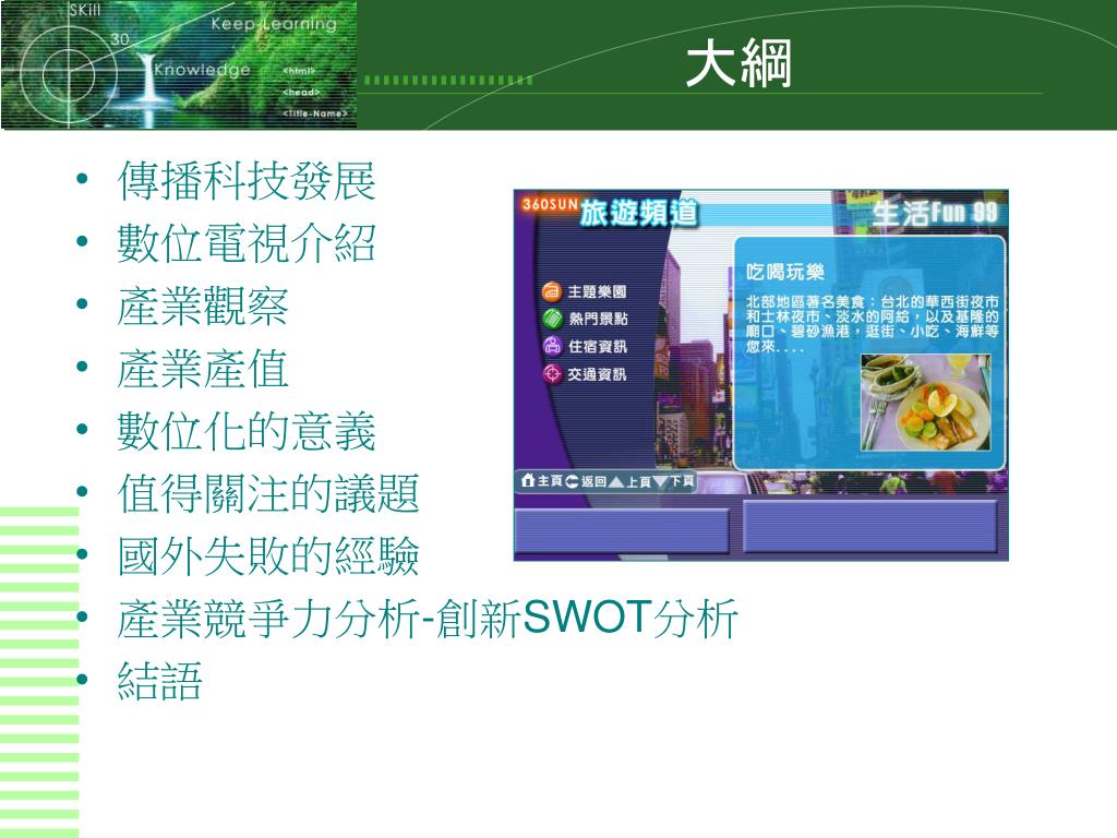 大綱 • 傳播科技發展 • 數位電視介紹 • 產業觀察 • 產業產值 • 數位化的意義 • 值得關注的議題 • 國外失敗的經驗 • 產業競爭力分析-創新SWOT分析 • 結語