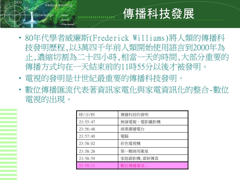 傳播科技發展 • 80年代學者威廉斯(Frederick Williams)將人類的傳播科技發明歷程,以3萬四千年前人類開始使用語言到2000年為止,濃縮切割為二十四小時,相當一天的時間,大部分重要的傳播方式均在一天結束前的11時55分以後才被發明。 • 電視的發明是廿世紀最重要的傳播科技發明。 • 數位傳播匯流代表著資訊家電化與家電資訊化的整合-數位電視的出現。