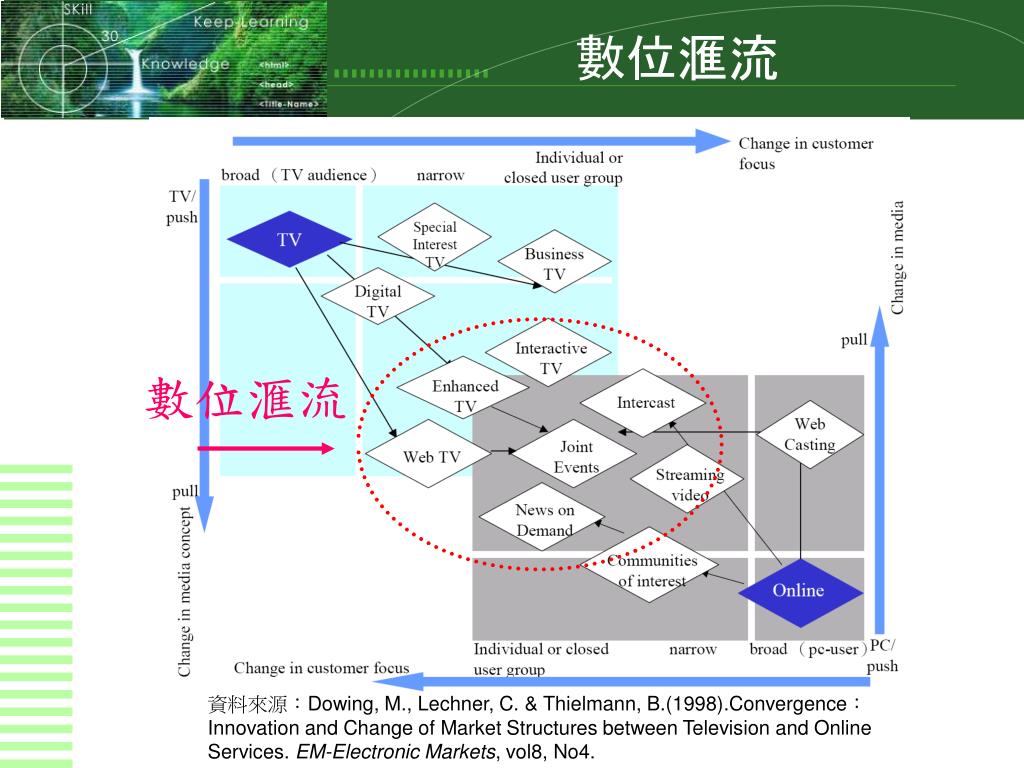 數位滙流 數位滙流 資料來源:Dowing, M., Lechner, C. & Thielmann, B.(1998).Convergence:Innovation and Change of Market Structures between Television and Online Services. EM-Electronic Markets, vol8, No4.