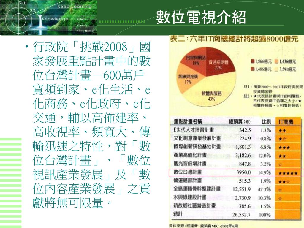 數位電視介紹 • 行政院「挑戰2008」國家發展重點計畫中的數位台灣計畫-600萬戶寬頻到家、e化生活、e化商務、e化政府、e化交通,輔以高佈建率、高收視率、頻寬大、傳輸迅速之特性,對「數位台灣計畫」、「數位視訊產業發展」及「數位內容產業發展」之貢獻將無可限量。