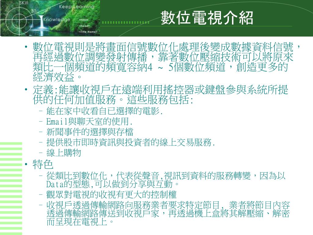 數位電視介紹 • 數位電視則是將畫面信號數位化處理後變成數據資料信號,再經過數位調變發射傳播,靠著數位壓縮技術可以將原來類比一個頻道的頻寬容納4 ~ 5個數位頻道,創造更多的經濟效益。 • 定義:能讓收視戶在遠端利用搖控器或鍵盤參與系統所提供的任何加值服務。這些服務包括: • 能在家中收看自已選擇的電影. • Email與聊天室的使用. • 新聞事件的選擇與存檔 • 提供股市即時資訊與投資者的線上交易服務. • 線上購物 • 特色 • 從類比到數位化,代表從聲音,視訊到資料的服務轉變,因為以Data的型態,可以做到分享與互動。 • 觀眾對電視的收視有更大的控制權 • 收視戶透過傳輸網路向服務業者要求特定節目, 業者將節目內容透過傳輸網路傳送到收視戶家,再透過機上盒將其解壓縮、解密而呈現在電視上。