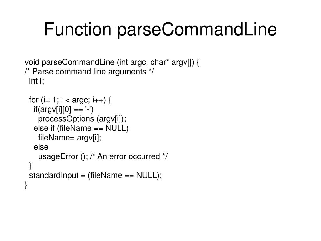 Function parseCommandLine void parseCommandLine (int argc, char* argv[]) { /* Parse command line arguments */ int i; for (i= 1; i < argc; i++) { if(argv[i][0] == '-') processOptions (argv[i]); else if (fileName == NULL) fileName= argv[i]; else usageError (); /* An error occurred */ } standardInput = (fileName == NULL); }