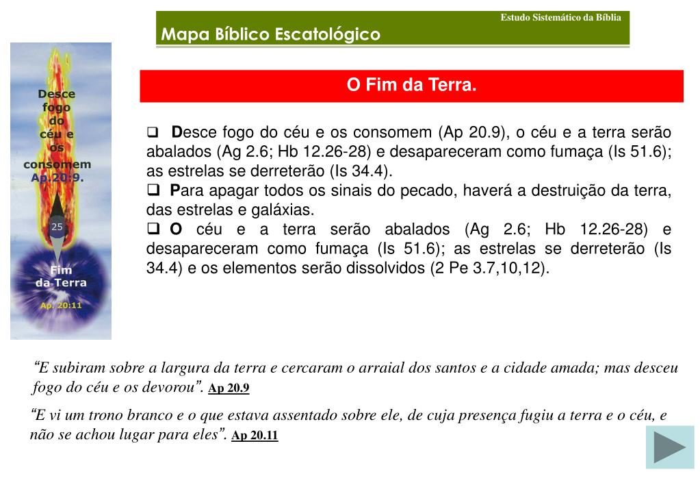 Estudo Sistemático da Bíblia Mapa Bíblico Escatológico O Fim da Terra. • Desce fogo do céu e os consomem (Ap 20.9), o céu e a terra serão abalados (Ag 2.6; Hb 12.26-28) e desapareceram como fumaça (Is 51.6); as estrelas se derreterão (Is 34.4). • Para apagar todos os sinais do pecado, haverá a destruição da terra, das estrelas e galáxias. • O céu e a terra serão abalados (Ag 2.6; Hb 12.26-28) e desapareceram como fumaça (Is 51.6); as estrelas se derreterão (Is 34.4) e os elementos serão dissolvidos (2 Pe 3.7,10,12). “E subiram sobre a largura da terra e cercaram o arraial dos santos e a cidade amada; mas desceu fogo do céu e os devorou”.Ap 20.9 “E vi um trono branco e o que estava assentado sobre ele, de cuja presença fugiu a terra e o céu, e não se achou lugar para eles”.Ap 20.11