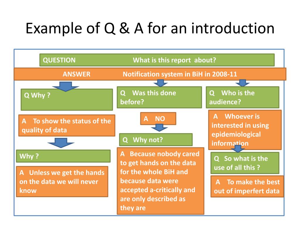 Example of Q & A for an introduction QUESTION What is this report about? ANSWER Notification system in BiH in 2008-11 Q Was this done before? Q Who is the audience? Q Why ? A Whoever is interested in using epidemiological information A NO A To show the status of the quality of data Q Why not? A Because nobody cared to get hands on the data for the whole BiH and because data were accepted a-critically and are only described as they are Why ? Q So what is the use of all this ? A Unless we get the hands on the data we will never know A To make the best out of imperfert data
