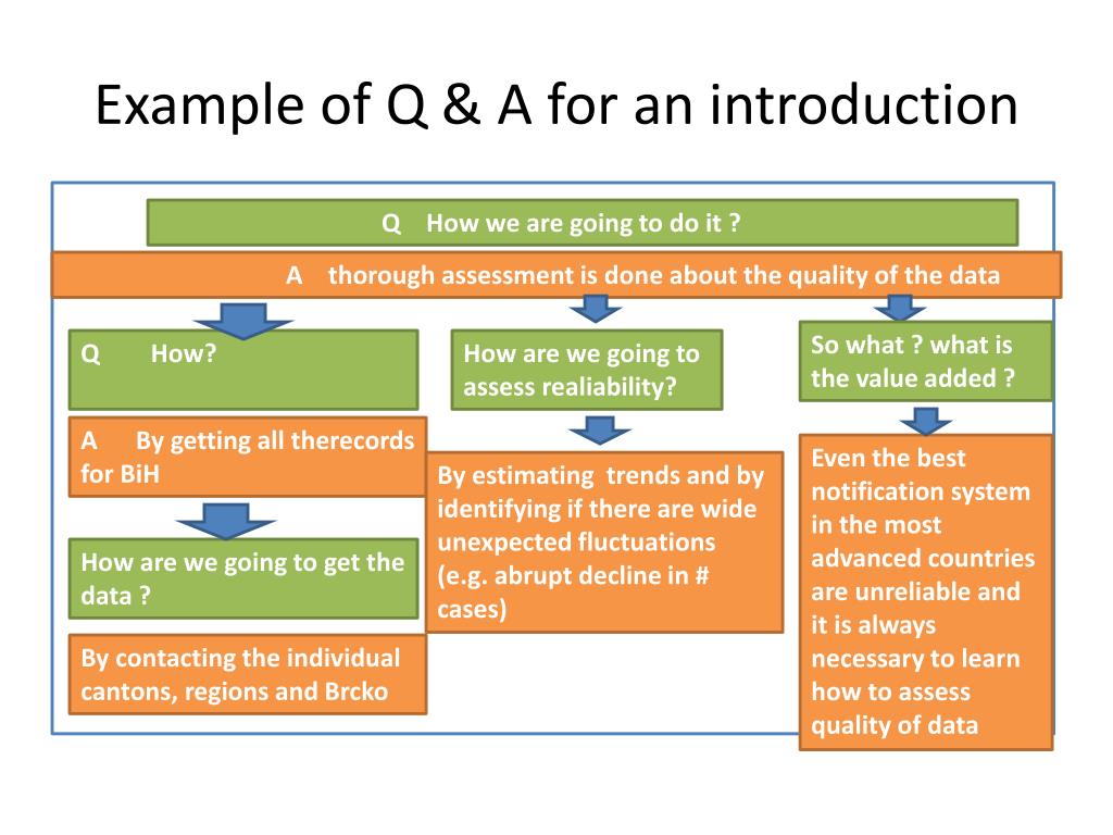 Example of Q & A for an introduction Q How we are going to do it ? A thorough assessment is done about the quality of the data So what ? what is the value added ? Q How? How are we going to assess realiability? A By getting all therecords for BiH Even the best notification system in the most advanced countries are unreliable and it is always necessary to learn how to assess quality of data By estimating trends and by identifying if there are wide unexpected fluctuations (e.g. abrupt decline in # cases) How are we going to get the data ? By contacting the individual cantons, regions and Brcko