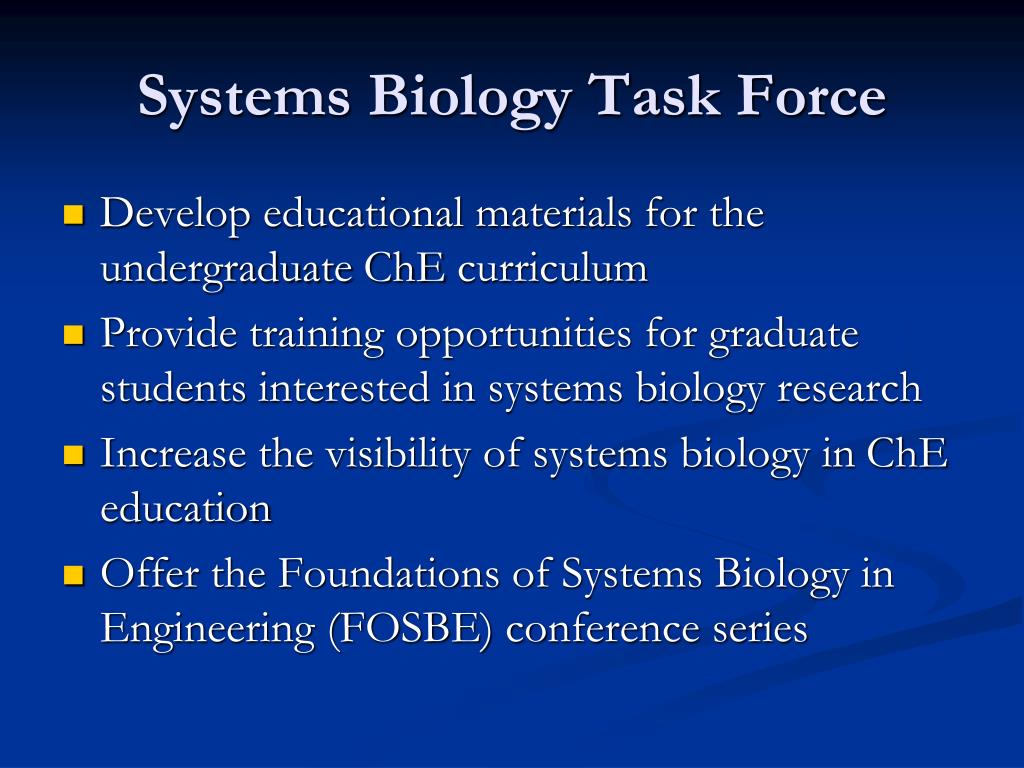 Systems Biology Task Force Develop educational materials for the undergraduate ChE curriculum Provide training opportunities for graduate students interested in systems biology research Increase the visibility of systems biology in ChE education Offer the Foundations of Systems Biology in Engineering (FOSBE) conference series