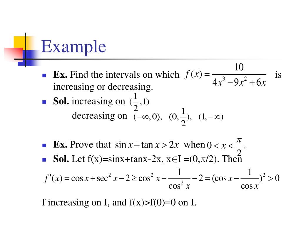 Example • Ex. Find the intervals on which is increasing or decreasing. • Sol. increasing on decreasing on • Ex. Prove that when • Sol. Let f(x)=sinx+tanx-2x, x2I =(0,p/2). Then f increasing on I, and f(x)>f(0)=0 on I.