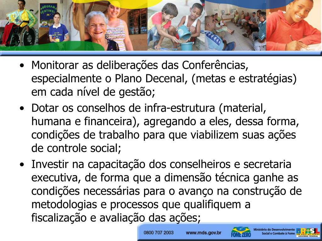 Monitorar as deliberações das Conferências, especialmente o Plano Decenal, (metas e estratégias) em cada nível de gestão; • Dotar os conselhos de infra-estrutura (material, humana e financeira), agregando a eles, dessa forma, condições de trabalho para que viabilizem suas ações de controle social; • Investir na capacitação dos conselheiros e secretaria executiva, de forma que a dimensão técnica ganhe as condições necessárias para o avanço na construção de metodologias e processos que qualifiquem a fiscalização e avaliação das ações;