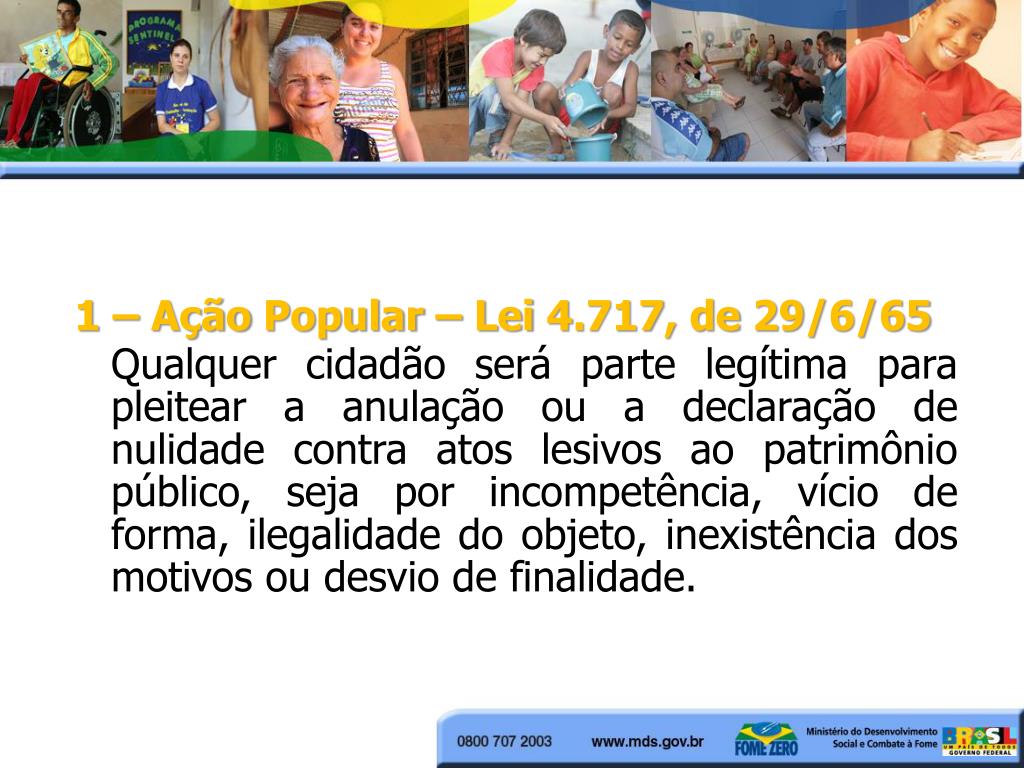 1 – Ação Popular – Lei 4.717, de 29/6/65 Qualquer cidadão será parte legítima para pleitear a anulação ou a declaração de nulidade contra atos lesivos ao patrimônio público, seja por incompetência, vício de forma, ilegalidade do objeto, inexistência dos motivos ou desvio de finalidade.