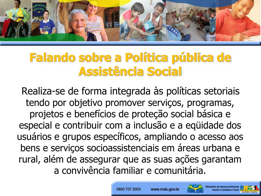 Falando sobre a Política pública de Assistência SocialRealiza-se de forma integrada às políticas setoriais tendo por objetivo promover serviços, programas, projetos e benefícios de proteção social básica e especial e contribuir com a inclusão e a eqüidade dos usuários e grupos específicos, ampliando o acesso aos bens e serviços socioassistenciais em áreas urbana e rural, além de assegurar que as suas ações garantam a convivência familiar e comunitária.