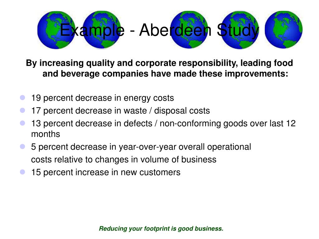 Example - Aberdeen Study By increasing quality and corporate responsibility, leading food and beverage companies have made these improvements: • 19 percent decrease in energy costs • 17 percent decrease in waste / disposal costs • 13 percent decrease in defects / non-conforming goods over last 12 months • 5 percent decrease in year-over-year overall operational costs relative to changes in volume of business • 15 percent increase in new customers Reducing your footprint is good business.