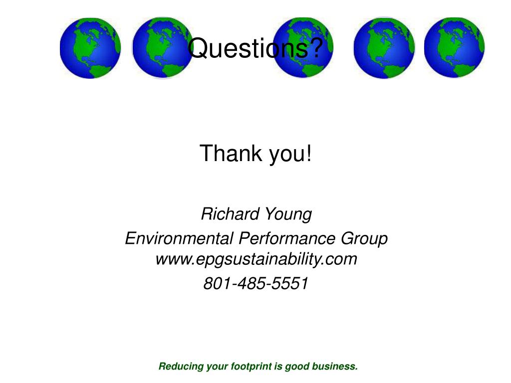 Questions? Thank you! Richard Young Environmental Performance Groupwww.epgsustainability.com 801-485-5551 Reducing your footprint is good business.