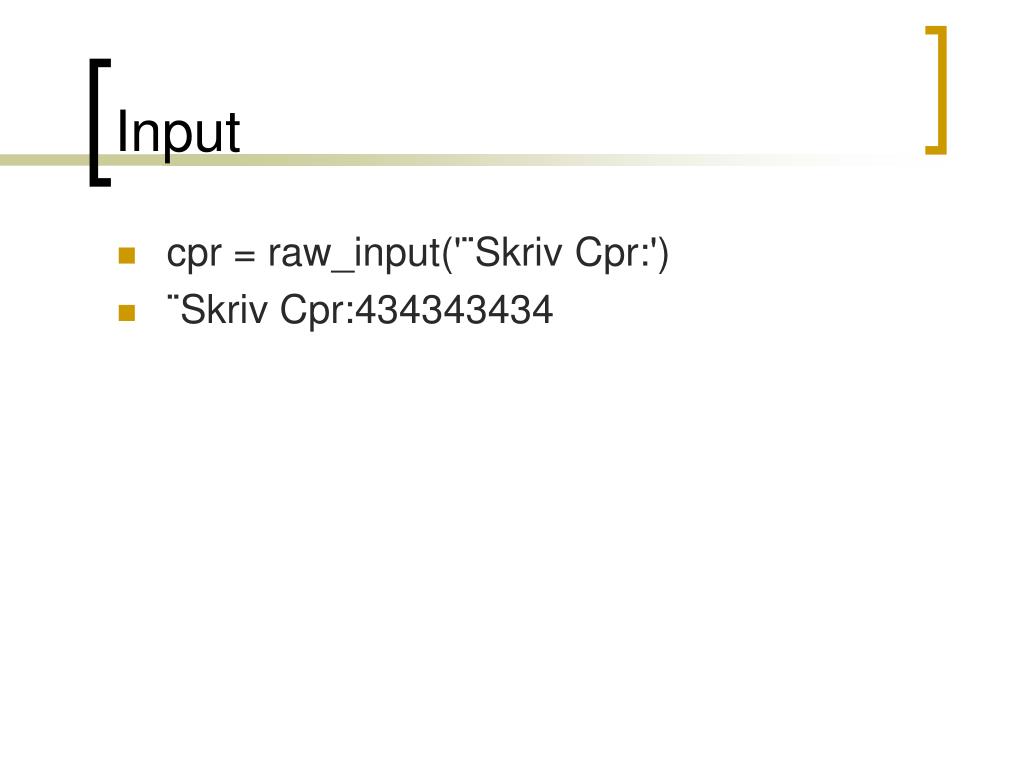 Input • cpr = raw_input('¨Skriv Cpr:') • ¨Skriv Cpr:434343434