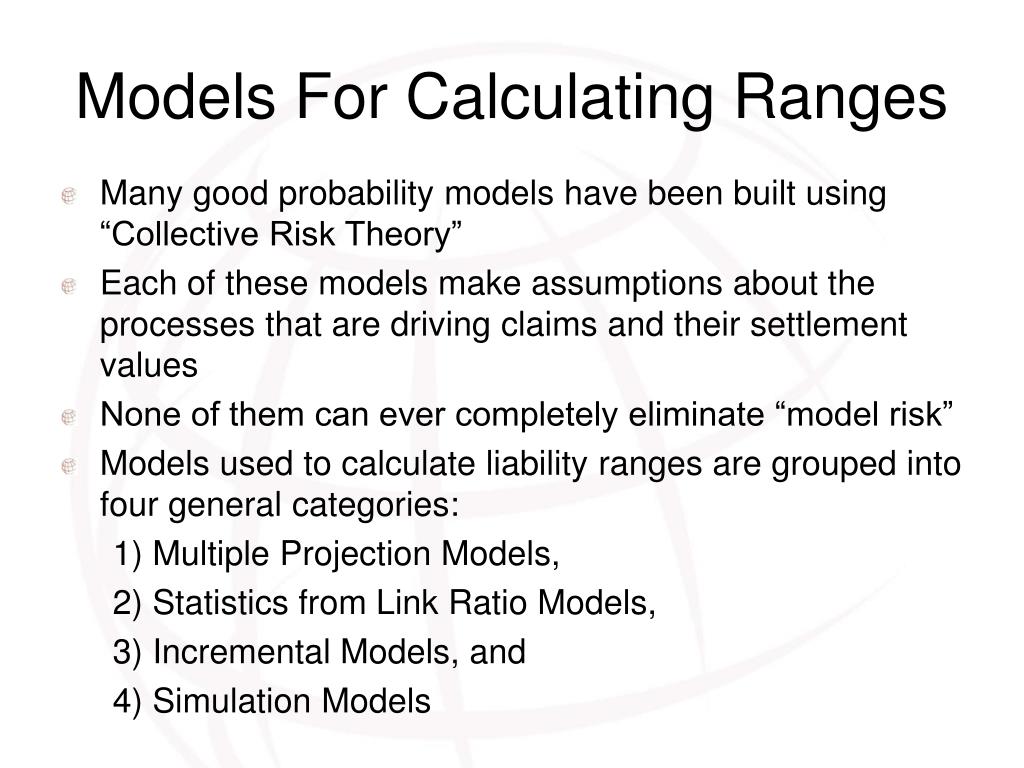 Models For Calculating Ranges • Many good probability models have been built using “Collective Risk Theory” • Each of these models make assumptions about the processes that are driving claims and their settlement values • None of them can ever completely eliminate “model risk” • Models used to calculate liability ranges are grouped into four general categories: 1) Multiple Projection Models, 2) Statistics from Link Ratio Models, 3) Incremental Models, and 4) Simulation Models