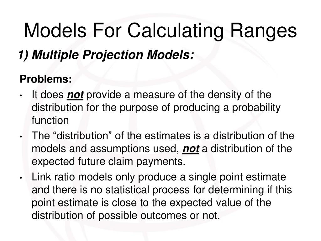 Models For Calculating Ranges 1) Multiple Projection Models: Problems: • Since there are no statistical measures for these models, any overall distribution for all lines of business combined will be based on the addition of the individual ranges by line of business with judgmental adjustments for covariance, if any.